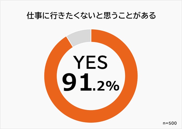 10代~60代の働く男女500人にアンケート調査を行った結果、「仕事に行きたくないと思うことがある」と回答した人は91.2%(500人中456人)。