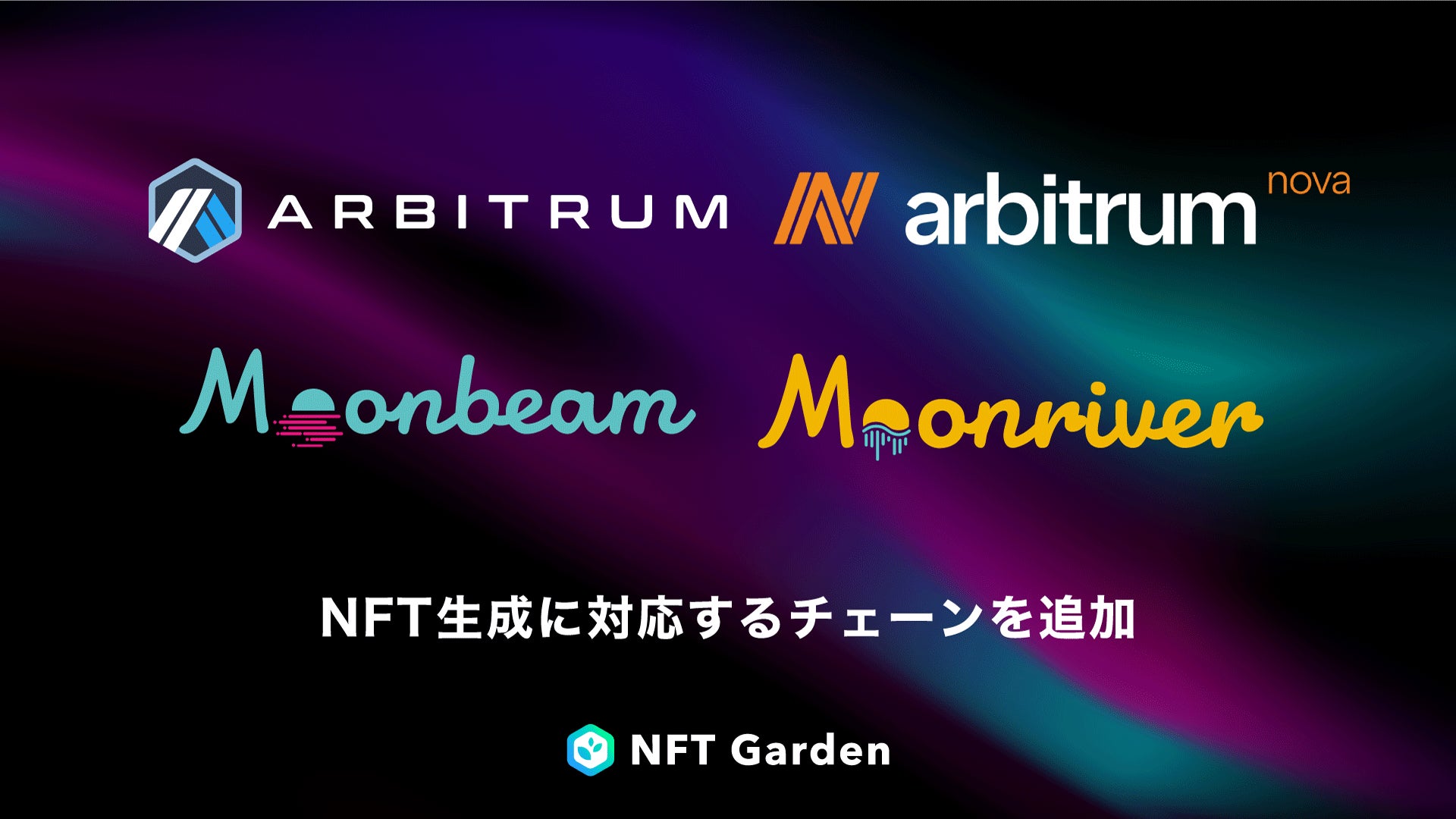 マルチチェーンNFT生成プラットフォーム『NFT Garden』は新規4チェーン Arbitrum One, Arbitrum Nova, Moonbeam, MoonriverでのNFT生成に対応