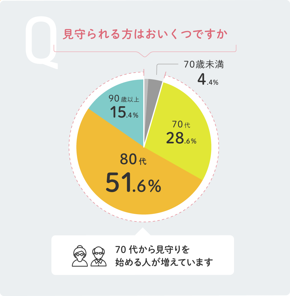 高齢者みまもりサービスを手がける当社は、「まもりこ」をご利用のお客さまを対象にアンケートを実施しました。その結果、見守られる方が70代になると見守りを始める人が増えています。