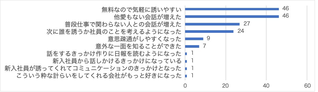「無料なので気軽に誘いやすい(46人)」と「他愛もない会話が増えた(46人)」という回答が最も多く、ちょっとしたリフレッシュの際に仕事ではない会話が生まれていました。