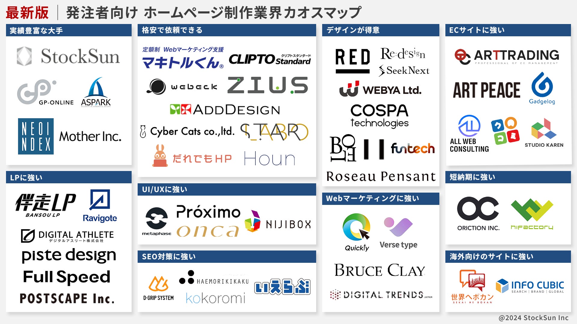 東京都新宿区 – 2024年12月19日 – デジタルマーケティングの最前線で活躍するStockSun株式会社(本社:東京都新宿区西新宿3丁目7-30 フロンティアグラン西新宿地下1階B102号室、以下 StockSun)は、最新の調査結果を基に「最新版|発注者向け ホームページ制作業界カオスマップ」を公開しました。このカオスマップは、発注者が最適なホームページ制作会社を見つけるために作成しました。