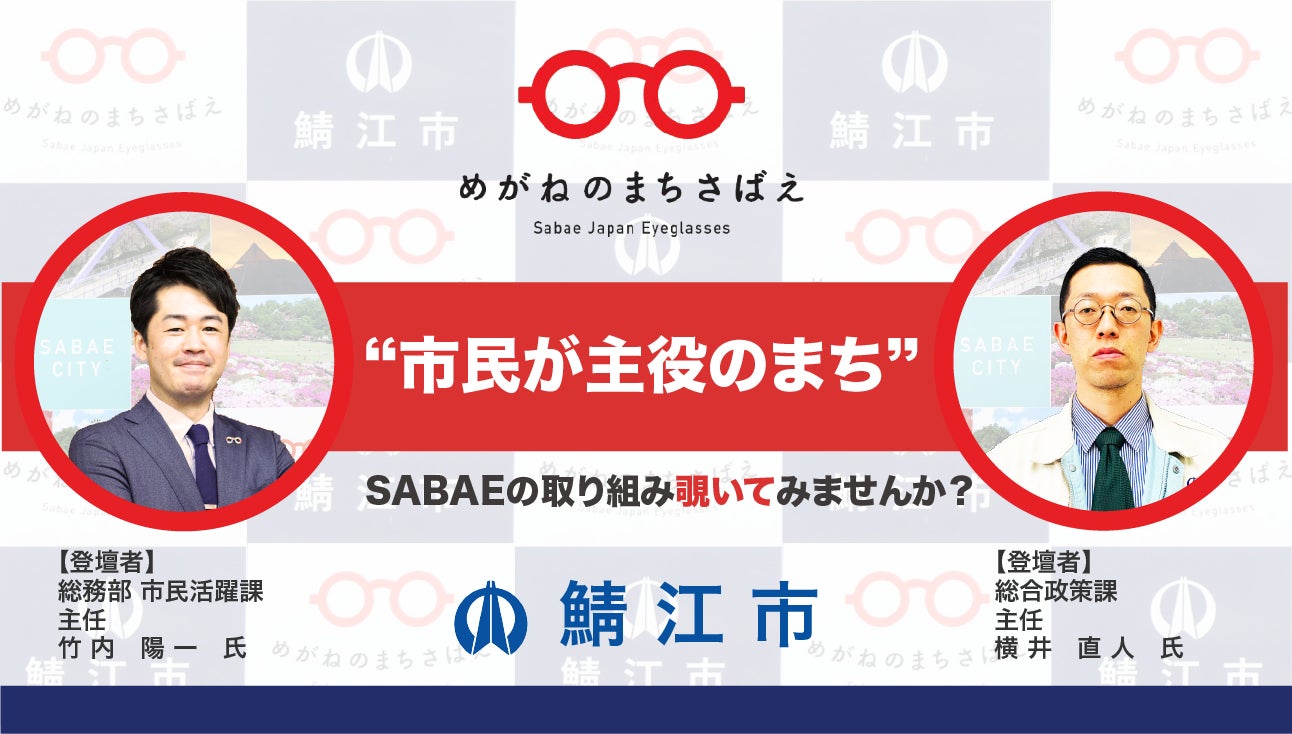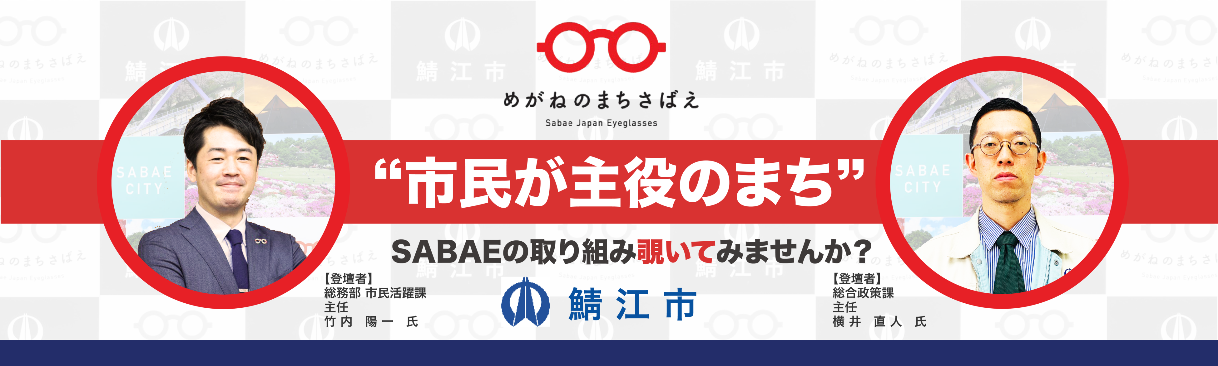 今月の職員LIVEは、「めがねのまち」「繊維のまち」「ITのまち」「ものづくりのまち」そして「市民主役のまち」である福井県鯖江市の自治体職員(総合政策課 横井直人氏、市民活躍課 竹内陽一氏)が登壇します。
