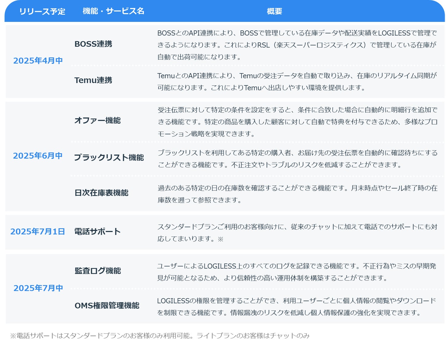 こうした背景を踏まえ、「LOGILESS」では2025年4月から7月にかけて、EC事業者の成長を後押しする新機能を順次リリースいたします。EC事業者の皆様が競争力を維持し、さらなる成長を遂げるための強力なサポートを段階的に提供します。