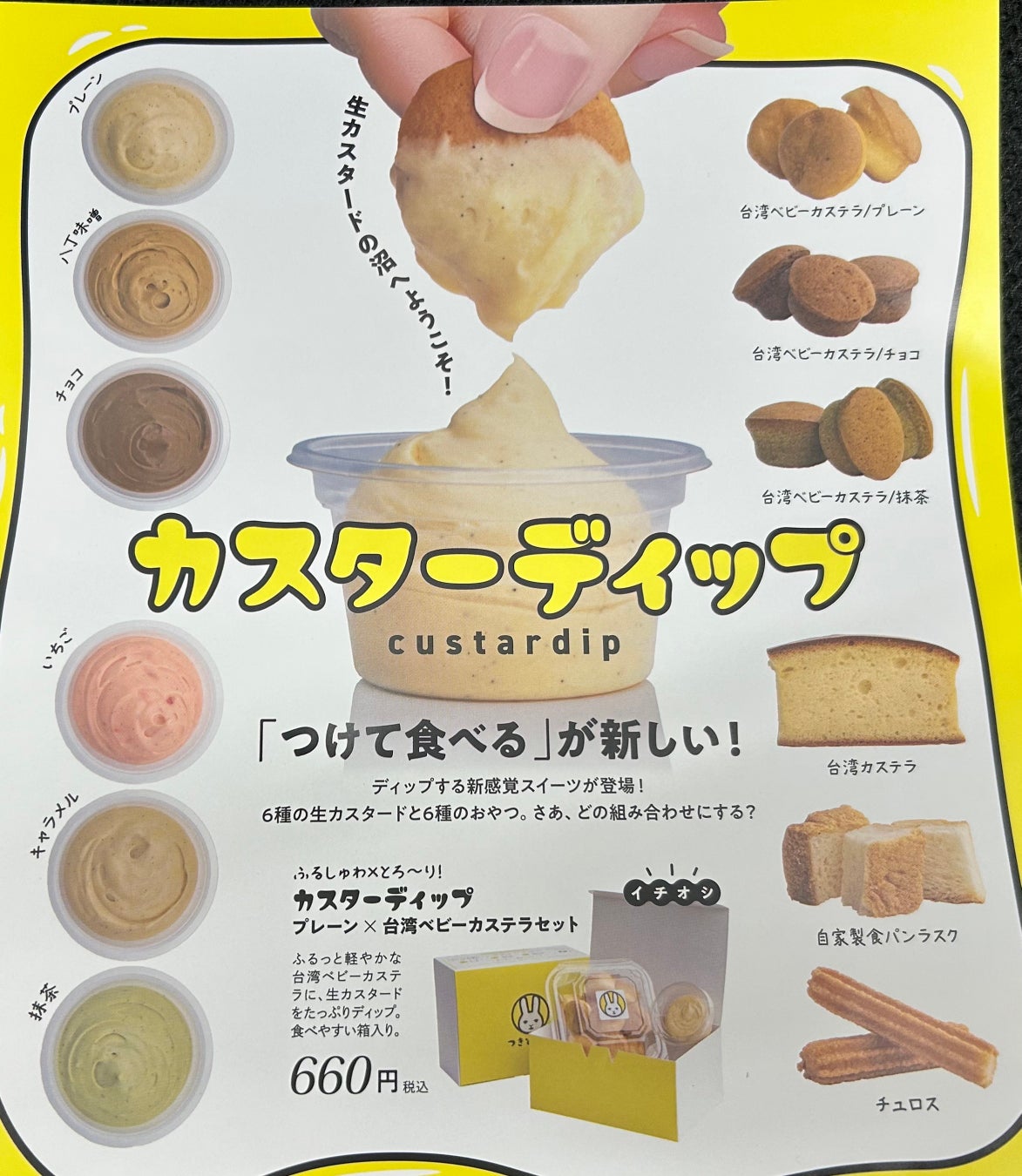 さらには生カスタードの種類は6種類、生カスタードをディップする食材も台湾べビカステラ、ミニチュロス、自家製食パンラスクを合わせて販売します。
