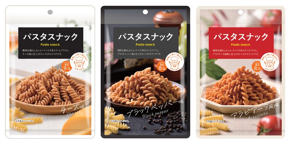 味はパスタ生地と相性の良い「チーズ味(※2)」、お酒のおつまみにもなる「ブラックペッパー味」、カフェでのランチをイメージした「アラビアータ風味」の3種類。糖質を気にする30代から40代の女性へ向けて、「美味しさと低糖質の両立」を提供致します。