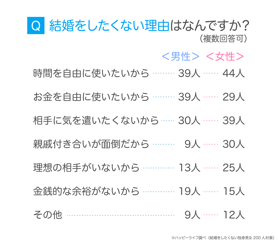 一方、女性は「時間を自由に使いたいから」と答えたのが最多の44人、次いで「相手に気を遣いたくないから」が39人、「親戚付き合いが面倒だから」が30人という結果でした。
