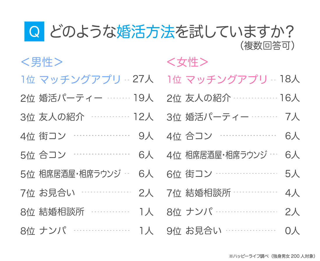 独身男女の主な婚活方法は「マッチングアプリ」ですが、「婚活パーティー」や「友人の紹介」を試している人も一定数いました。