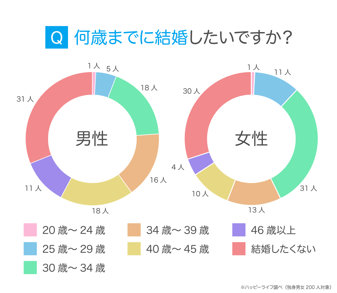 次いで「34歳〜39歳(16人)」、「46歳以上(11人)」と回答した人数が多く、20代までに結婚したい人は1割以下というデータが得られています。