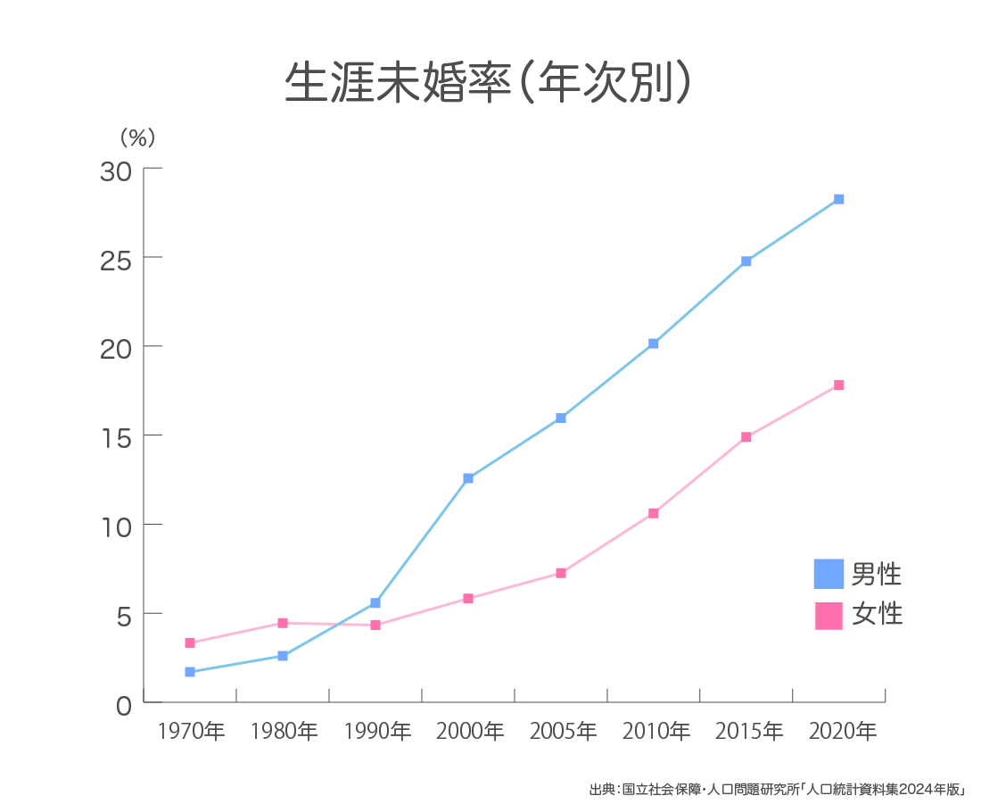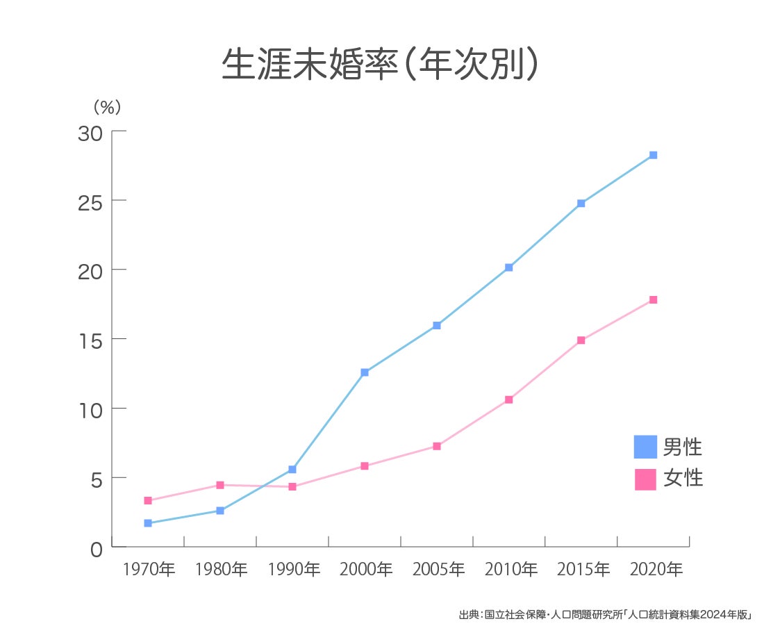 国立社会保障・人口問題研究所の統計によると、生涯未婚率は2020年時点で男性は28.25%、女性は17.81%でした。