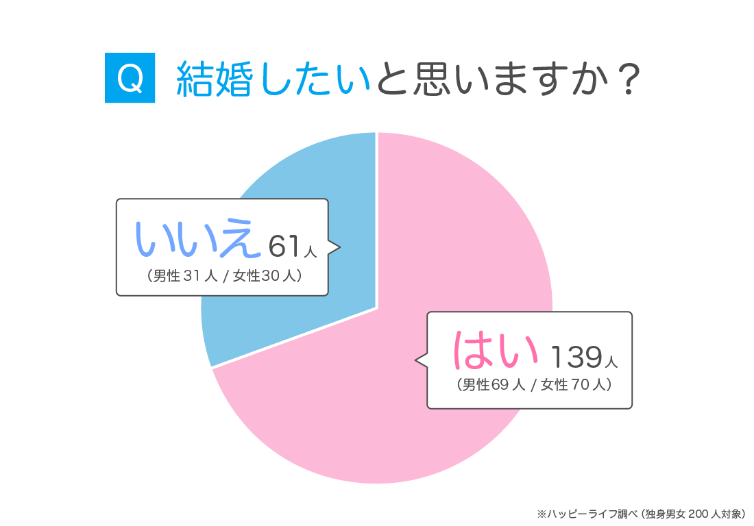 独身男女各100名に「結婚したいと思いますか?」と聞いたところ、「はい」と回答した男性は69人・女性は70人で、結婚願望がある人は男女ともに約7割でした。