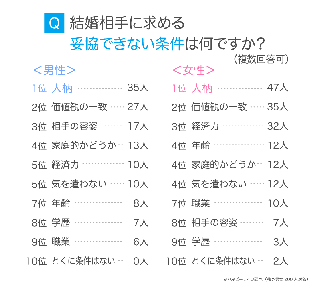 3位は男女で異なり、男性は「相手の容姿」、女性は「経済力」でした。
