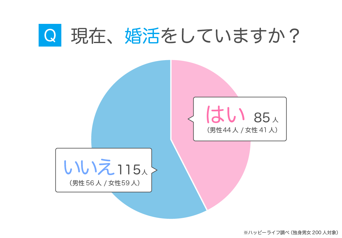 独身男女各100名に婚活しているかどうかを聞いたところ、「はい」と回答した男性は44人・女性は41人で、両者ともに約4割でした。
