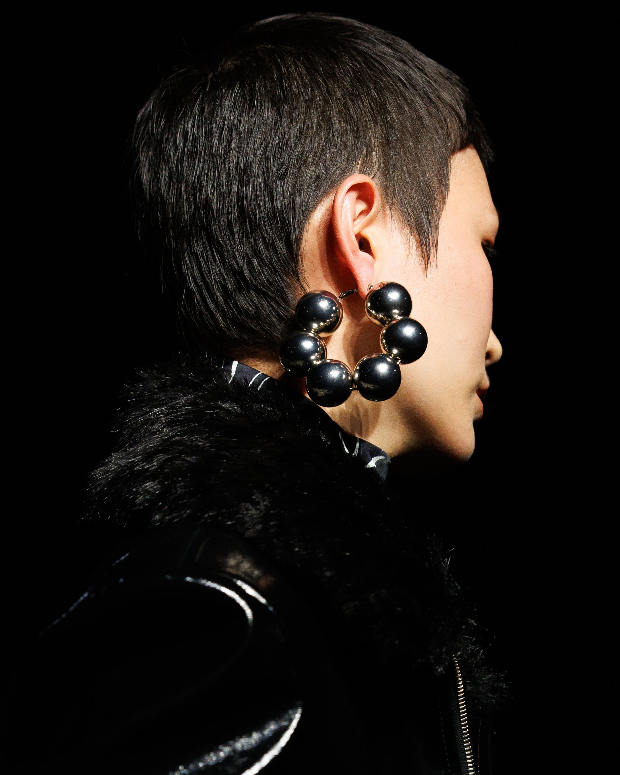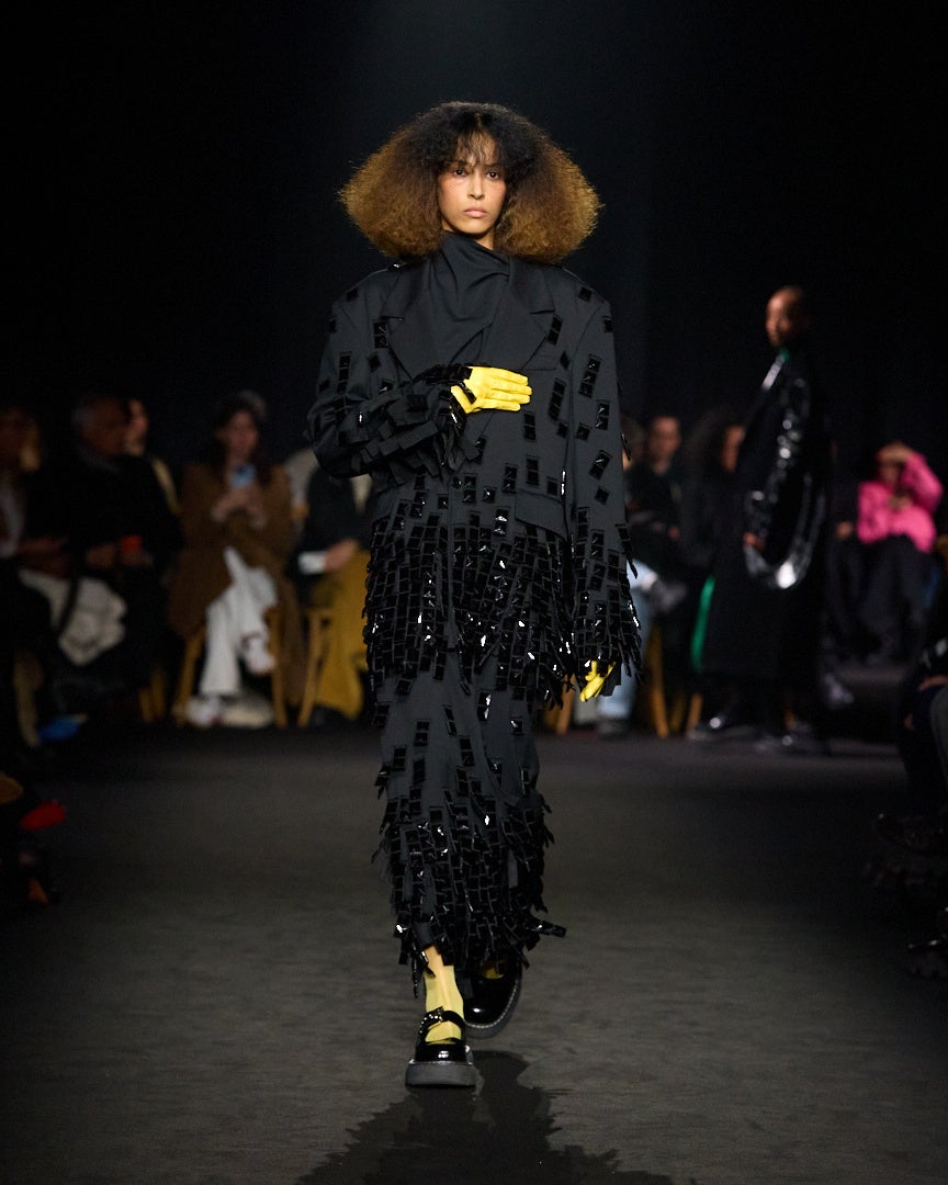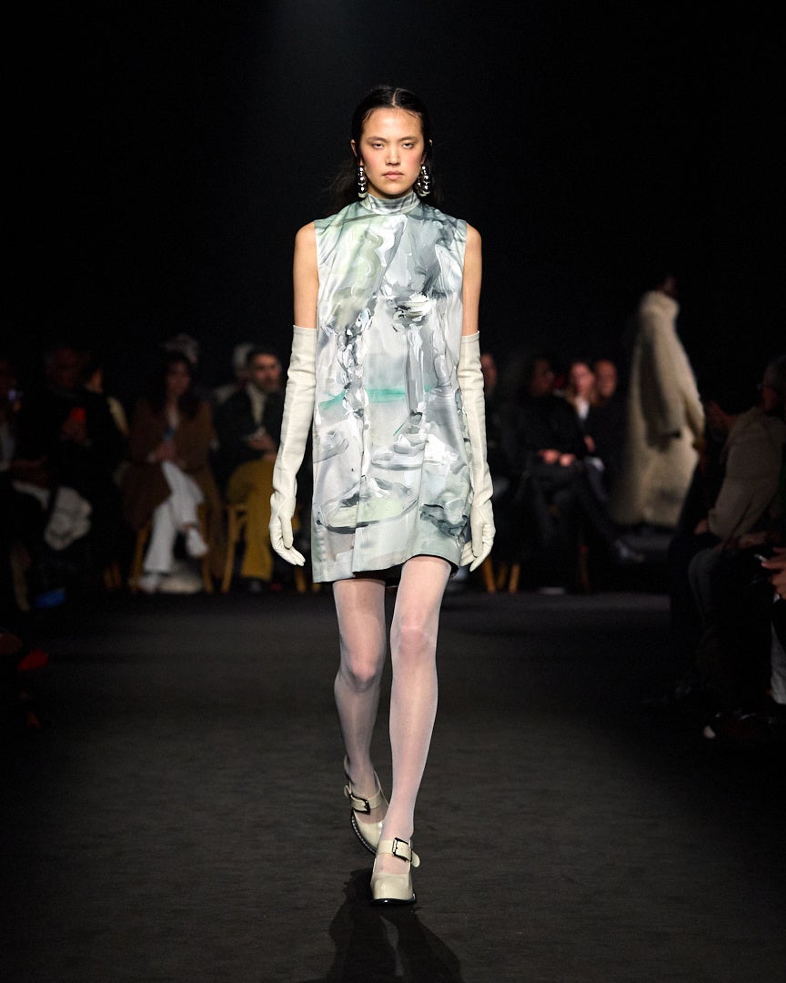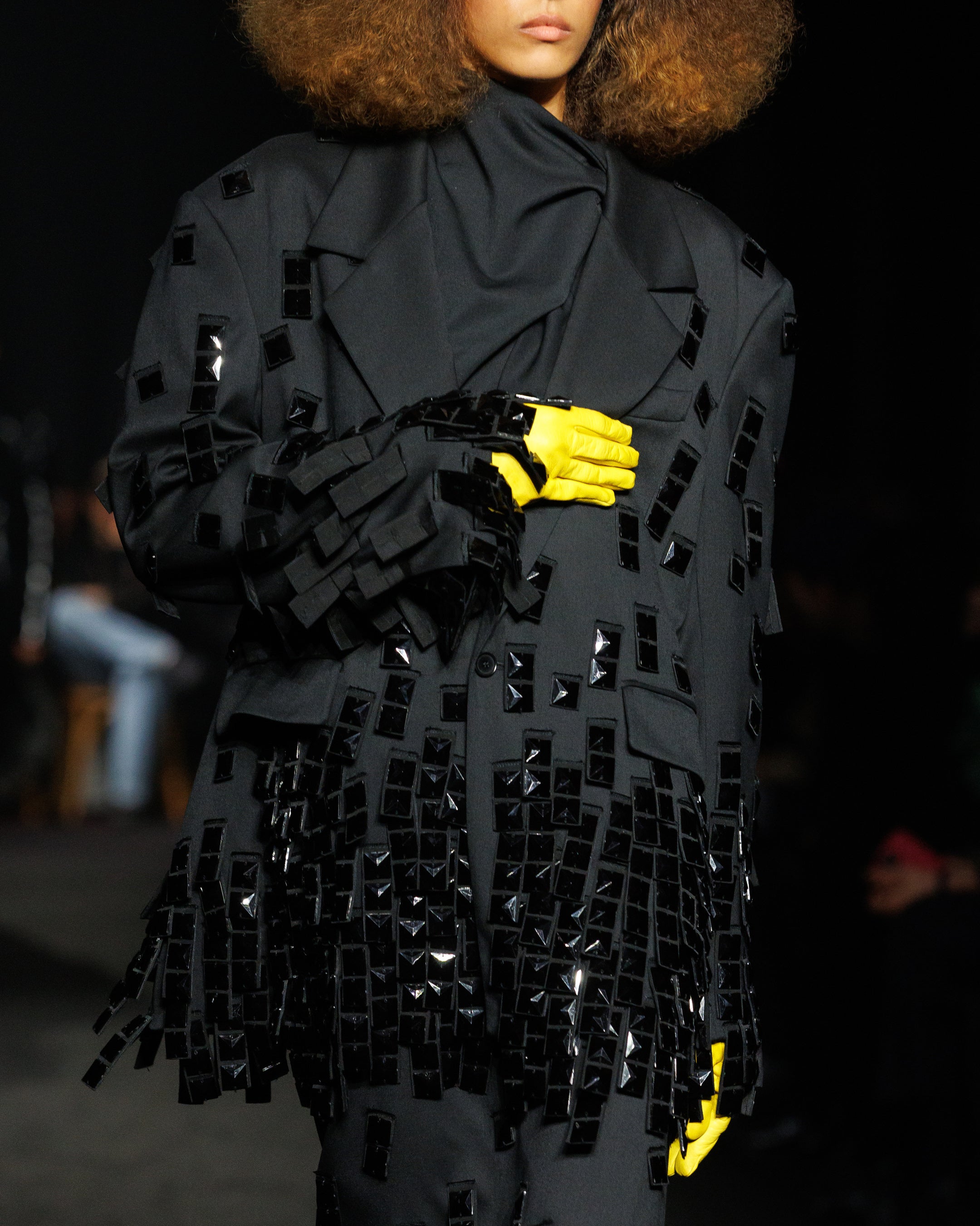 カクテルのアクセントはパンクのディテールと融合し、ボリュームと質感が強調されている -きらめく刺繍と光沢のあるマテリアル、 体にフィットしたアイテムとオーバーサイズの服が混ざり合い、親に借りてきたようなワードローブを新しいルックにアレンジ。 そして、皿、グラス、クリスタルのシャンデリア -上流階級の居間の表象- ベルギー人アーティスト、Jan De Vliegherの作品は 鮮やかなブラッシュストロークで衣服に描かれた。