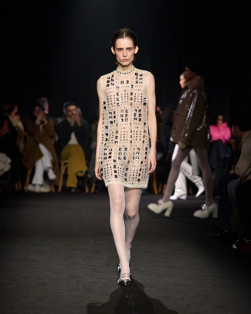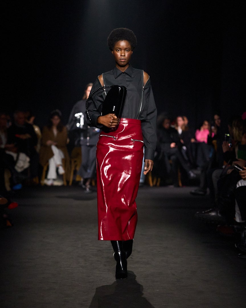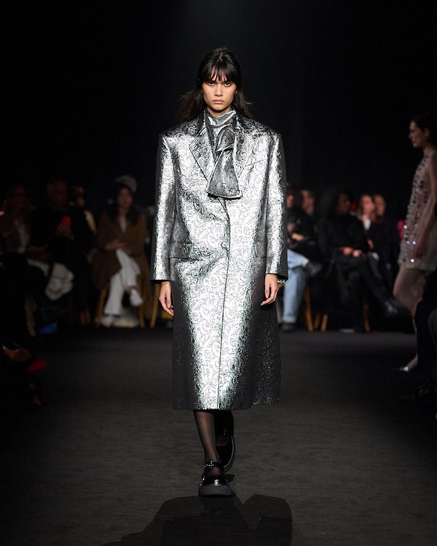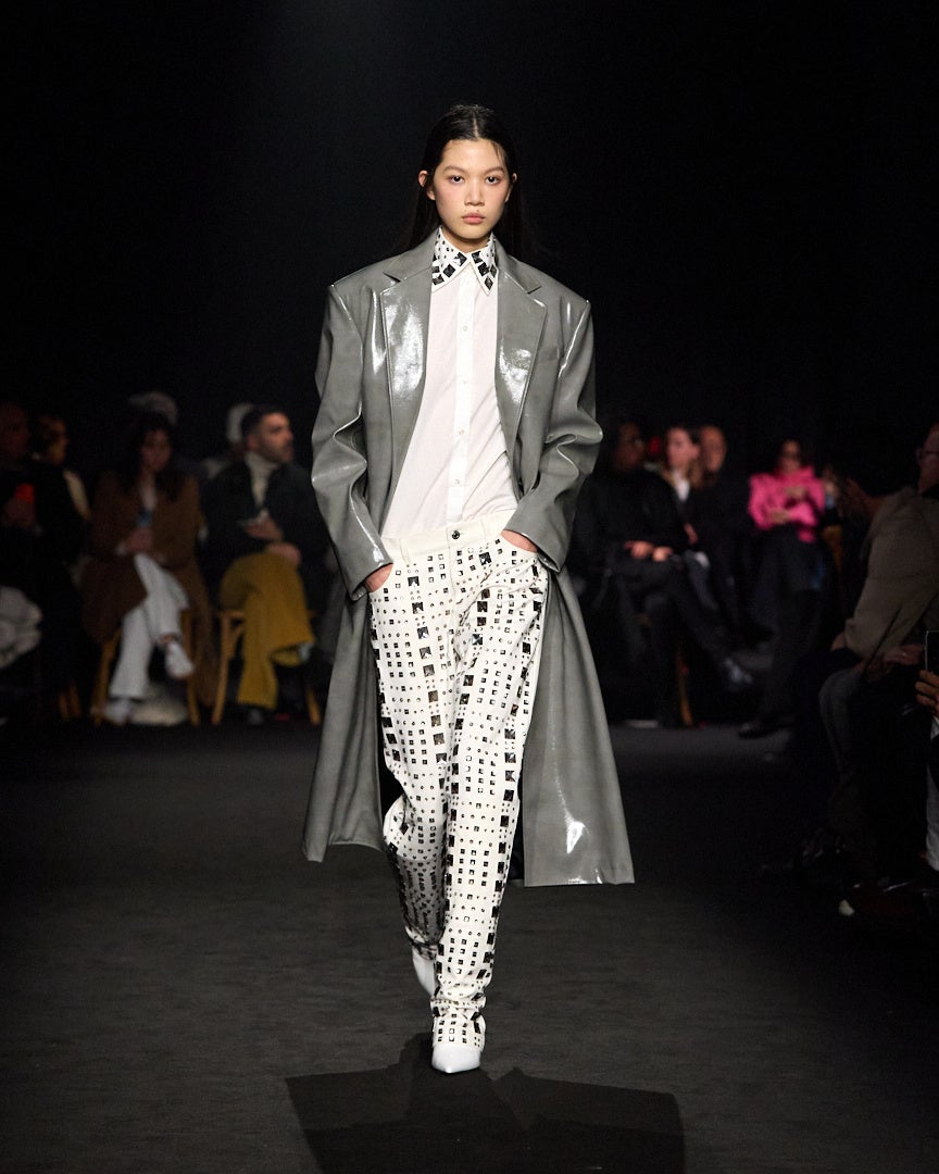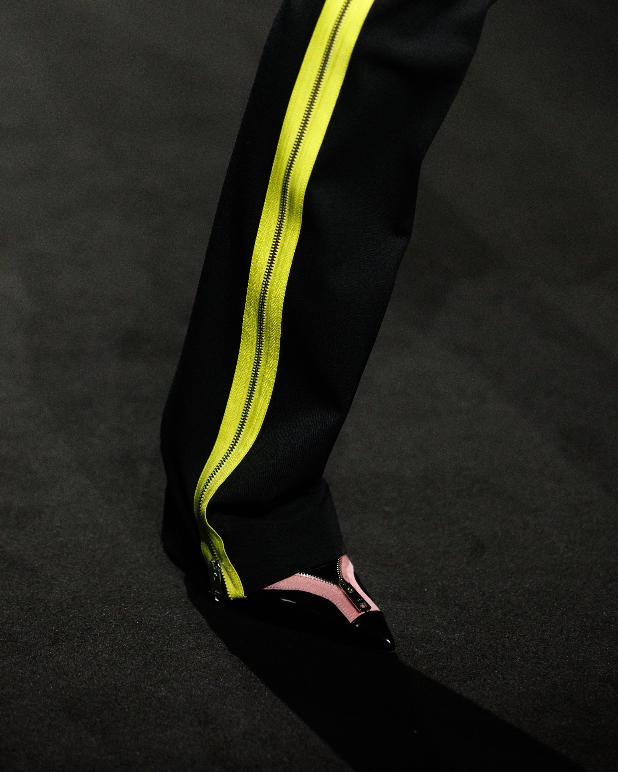 過去は再解釈され、歪められ、”スワン”というブルジョワの遺産はジッパーで引き裂かれ、クリスタルがちりばめられた。MSGMの 洗練された、よりクリーンでタフな進化である:コンクリートグレーとアンスラサイト、クリームとダストピンクの落ち着いたパレットに、 リップスティックレッドとセルリアンブルーのタッチを加え、深みのある黒の世界を表現した。
