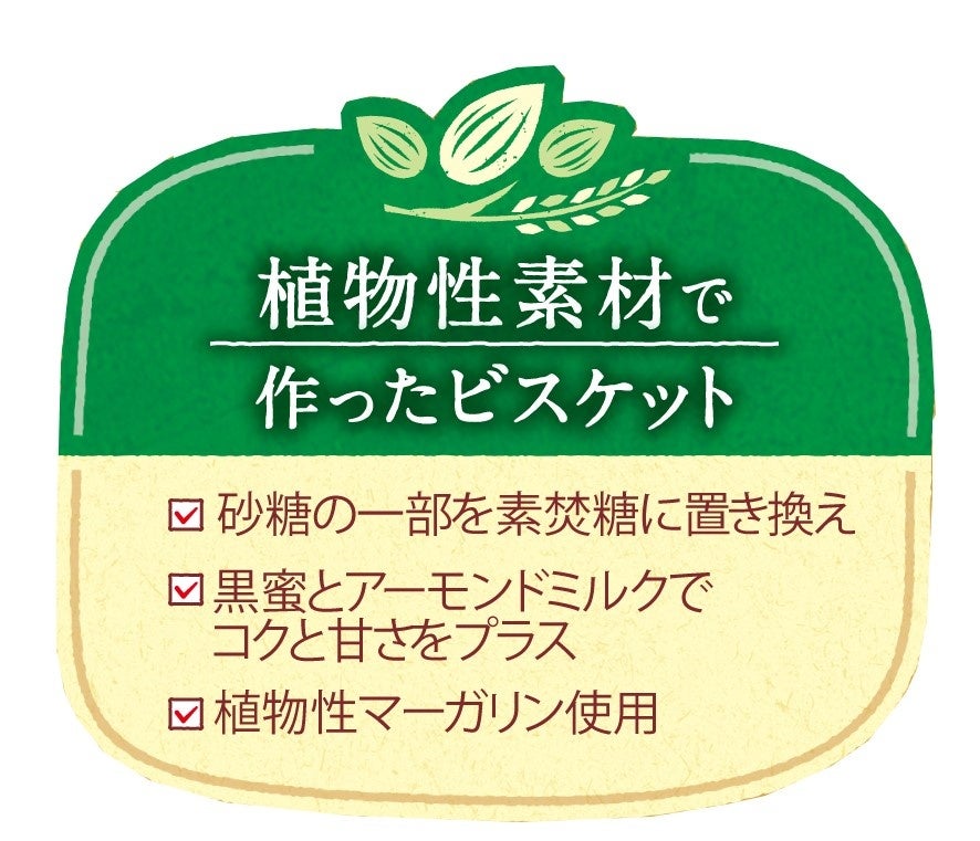 ・植物性ミルクや植物性素材(食塩・食品添加物を除く)でつくった、おいしく栄養も取れるビスケットです。