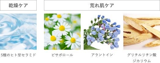 肌への負担に配慮しサポート成分を充実させ、より保湿力を高めました。肌のうるおいに欠かせない「5種のヒト型セラミド(*1)」をはじめ、肌荒れケア成分として「ビサボロール(*2)」、「アラントイン(*2)」、「グリチルリチン酸ジカリウム(*3)」をふんだんに配合。