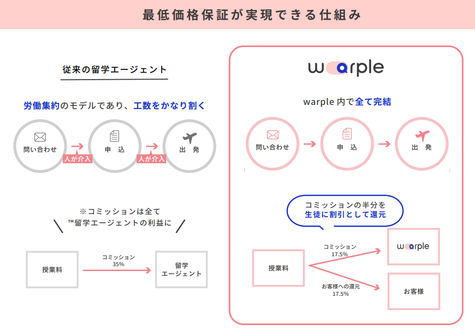 『warple(ワープル)』では、語学学校/プログラムの検索・お申込み、渡航までの準備、学校/宿泊先の手配など、全てをインターネット上で完結できます。そのため、仲介業で発生する人件費を省くことで留学費用をどこよりも安く提供。全てのプログラムにおいて最低価格を保証することを可能としました。