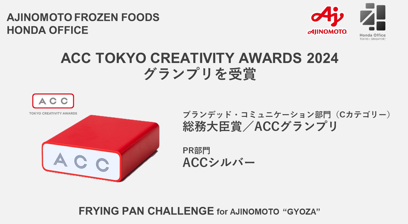 味の素冷凍食品株式会社(社長:寺本博之 本社:東京都中央区)と株式会社本田事務所(社長:本田 哲也、本社:東京都港区)は、一般社団法人 ACCが選出する「2024 64th ACC TOKYO CREATIVITY AWARDS」のブランデッド・コミュニケーション部門 Cカテゴリーにおいて総務大臣賞/ACCグランプリおよび、PR部門においてACCシルバーを受賞したことをお知らせいたします。現時点において「冷凍餃子フライパンチャレンジ」は、世界有数のPRアワードであるSABRE AwardsやSpikes Asiaなど国内外20冠の栄誉あるアワードをいただきました。