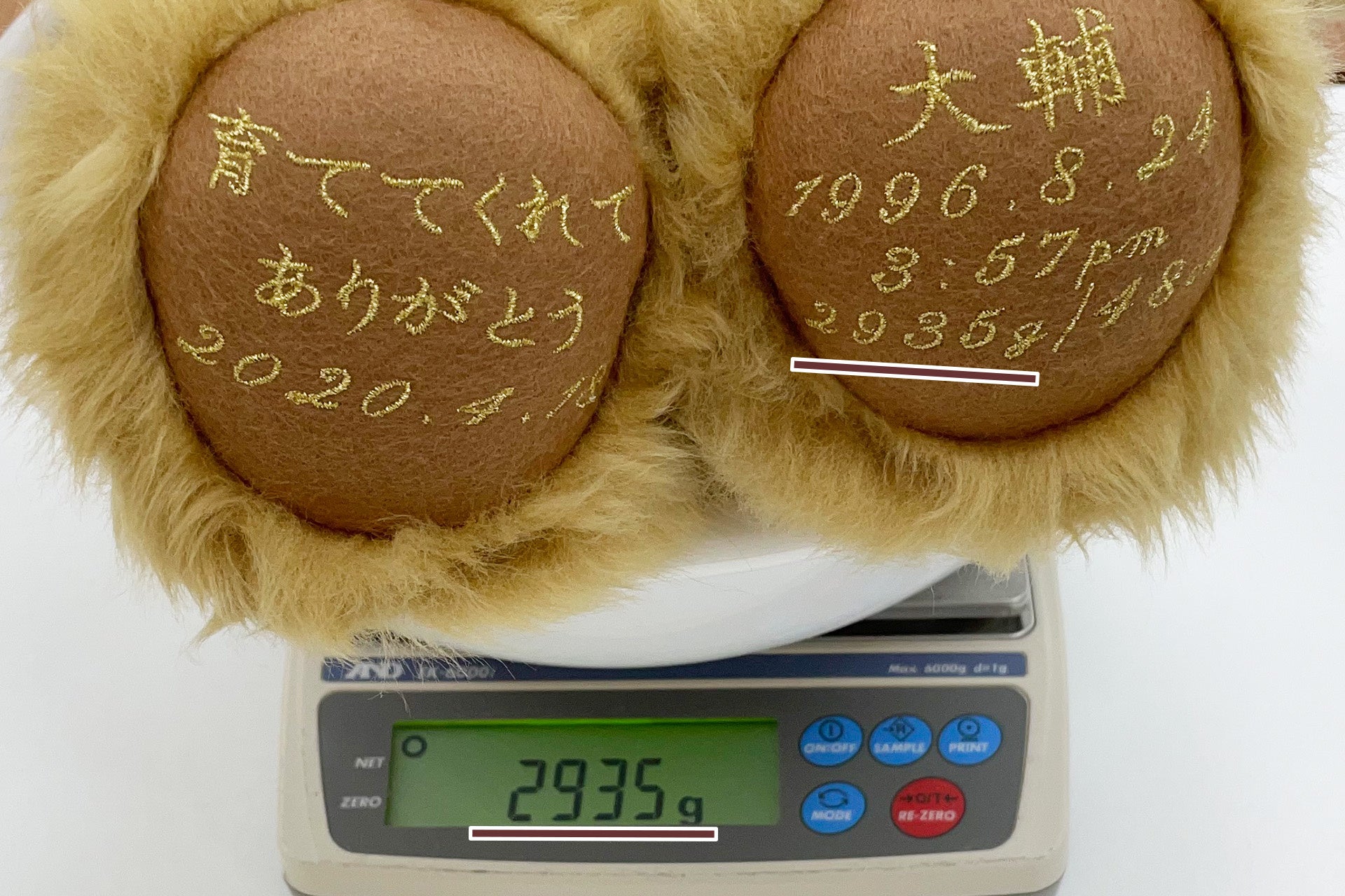 その異なる重さ(体重)を1g単位で再現し、ご希望で、お名前・生年月日、メッセージなどを刺繍することで、長く愛していただける世界で一つだけの宝物になります。