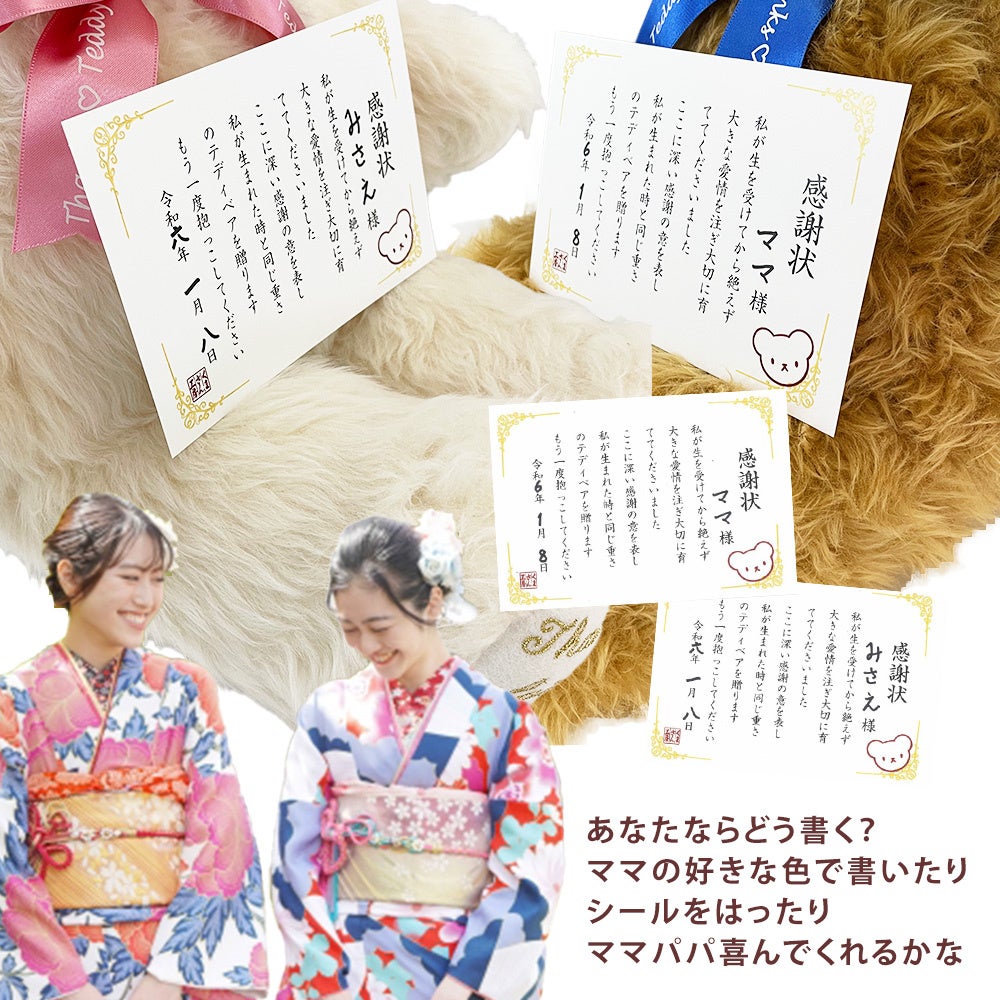 成人の日に、20年前の私を逆プレゼント!生まれた時の重さで作るテディベアでママパパに感謝を伝えます。「感謝状」がより感動を演出。Z世代の新成人に向けた特別な体重ベアのセット。12月1日受付開始