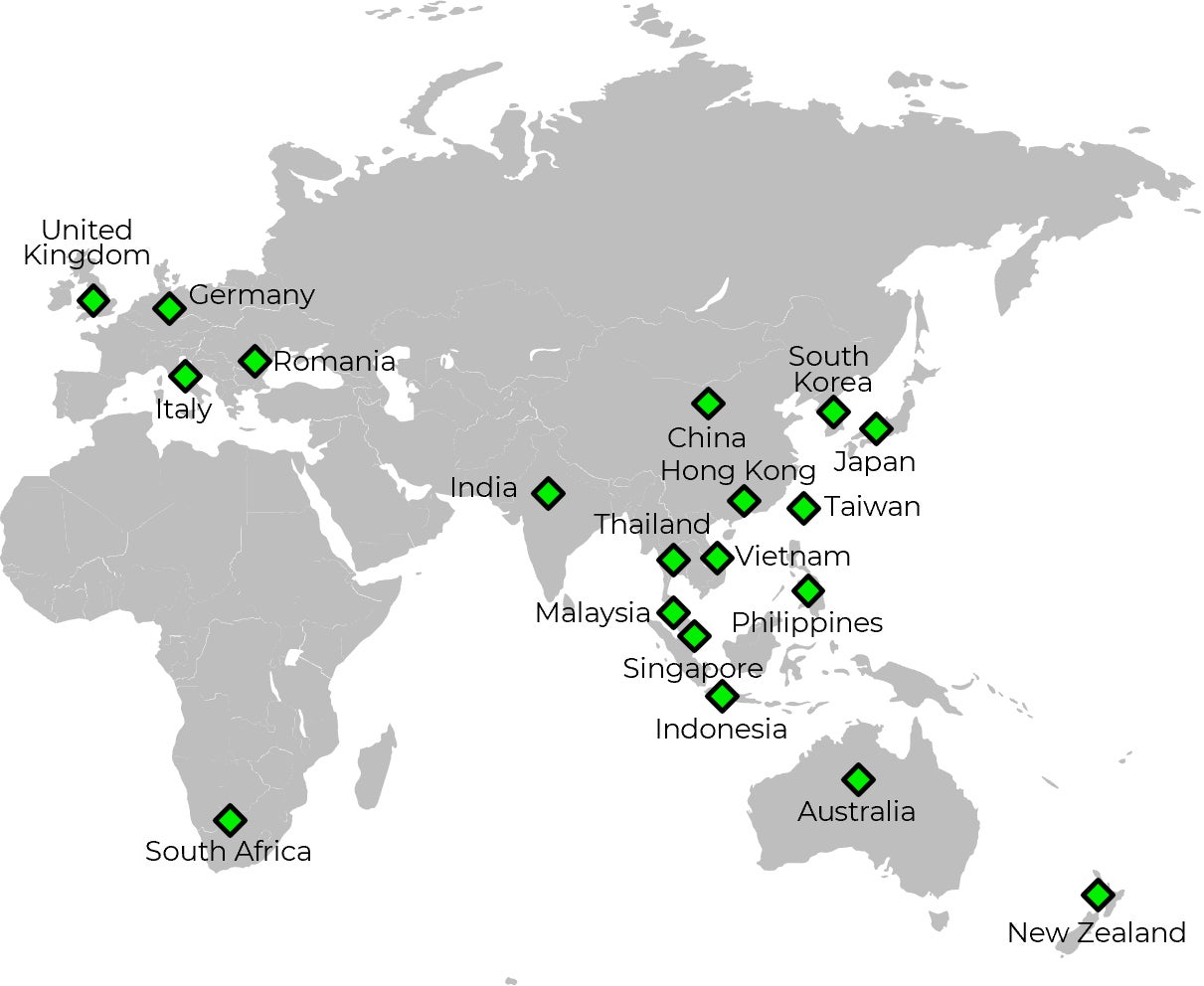 日本、韓国、台湾、中国、香港、ベトナム、フィリピン、タイ、シンガポール、マレーシア、インドネシア、インド、オーストラリア、ニュージーランド、イギリス、イタリア、ドイツ、ルーマニア、南アフリカ 計19カ国の予定