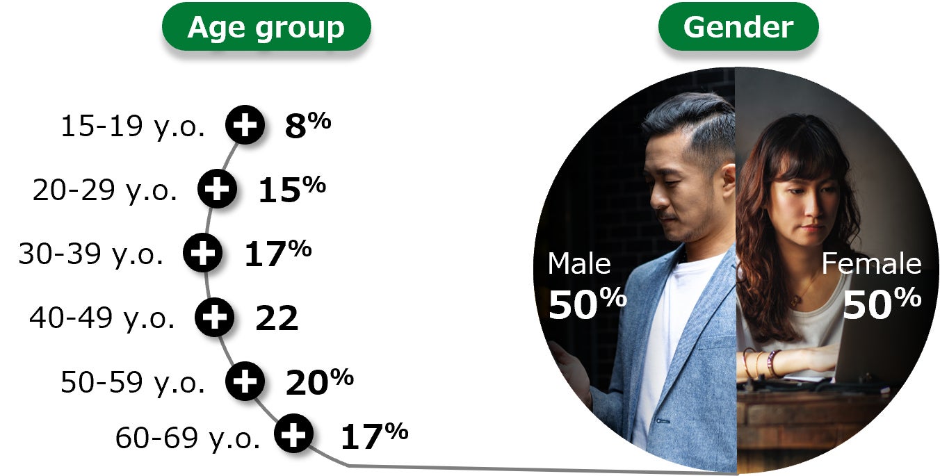 - 日本の人口構成に合わせて、性別・年齢別で割付