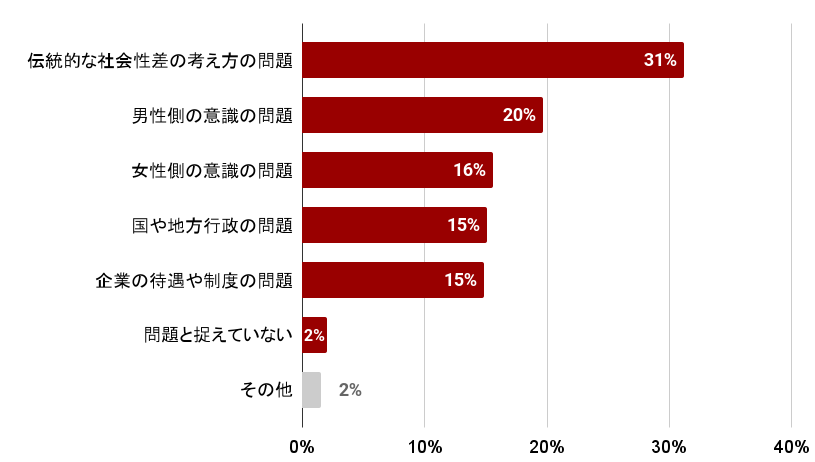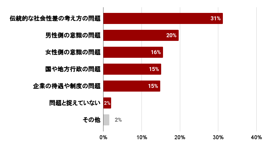 「教育機会均等」の高水準に対し「実際の活躍の場(政治・経済)」が少なくなる背景。8割以上が日本の「伝統的な社会性差の考え方」に起因すると回答