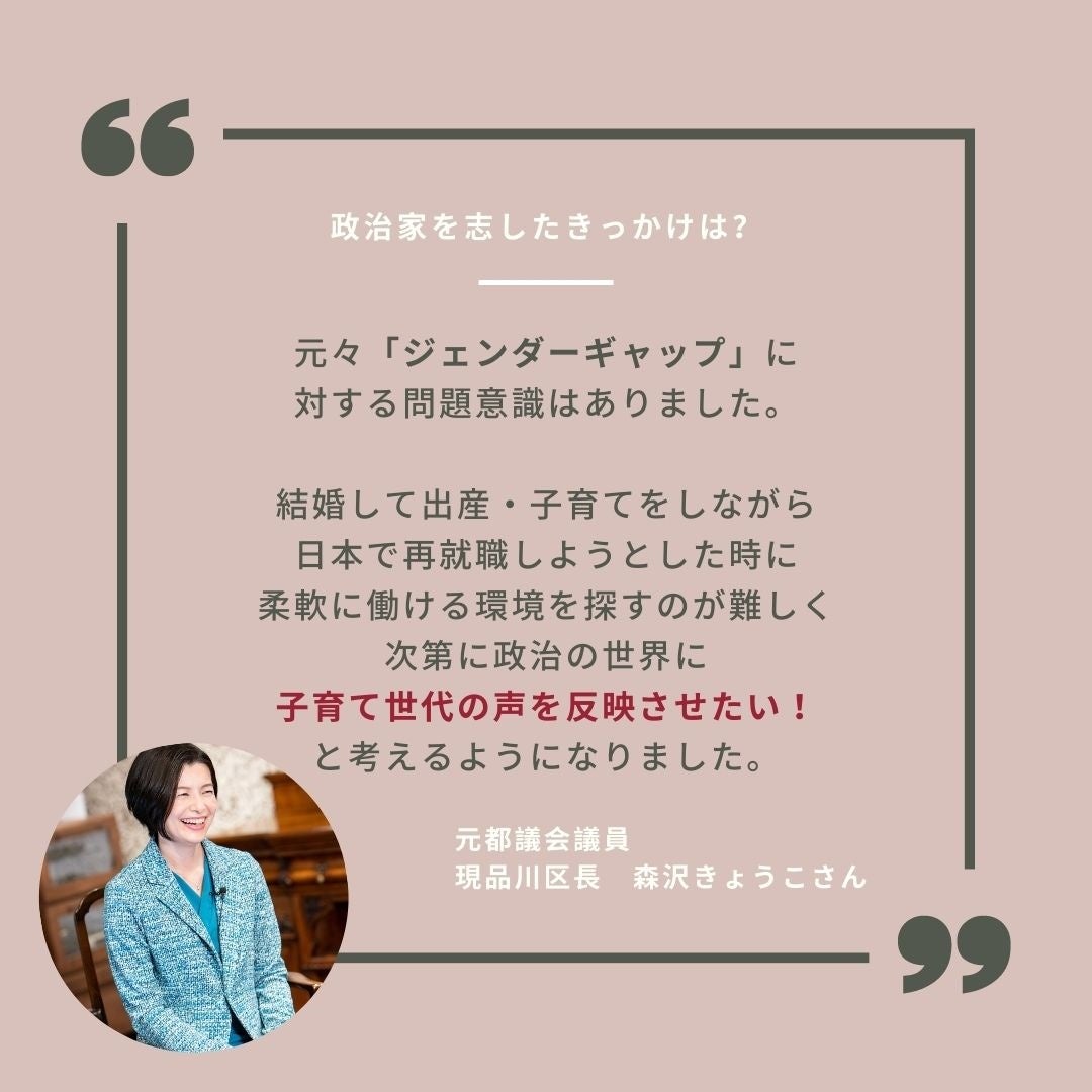 「政治へのクオータ制度の導入。実際、コーポレートガバナンスコートの改正やジェンダーイクォリティ開示要求は企業変革を促している」