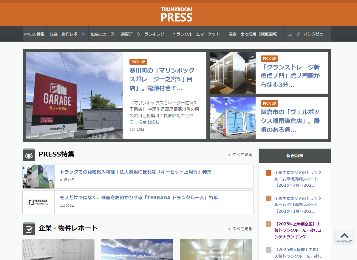また同サイト内の当社オウンドメディアである『TRUNKROOM PRESS(※3)』では主要エリアの平均賃料レポートや人気トランクルーム・貸しコンテナランキング、トランクルームに関する記事なども見ることができます。