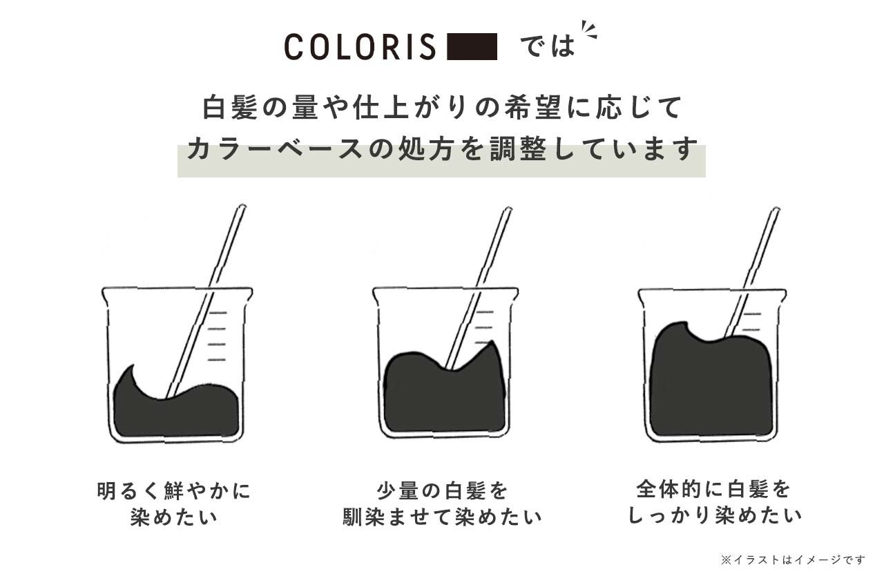 カラリスでは、WEBカウンセリングを通じて「白髪の量」「これまでの施術歴」「仕上がりの優先度」からヘアカラーの白髪処方を調整しています。「白髪があっても鮮やかに染めたい」と希望する人が多く、カラーベースの白髪染め含有量を調整することで、希望のイメージに併せた仕上がりを実現しています。