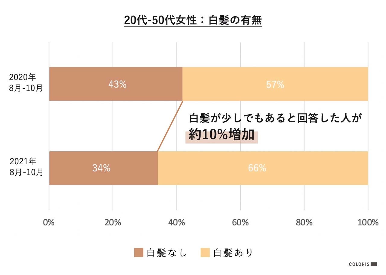 パーソナライズヘアカラー『COLORIS(カラリス)』を運営する株式会社ストークメディエーション(所在地:東京都渋谷区)は、2021年8月から10月にかけてカウンセリングユーザー7290人を対象に白髪に関するデータ調査を実施。前年の同期間と比較して20代から50代女性で白髪に悩む女性が10%増加したことが分かりました。