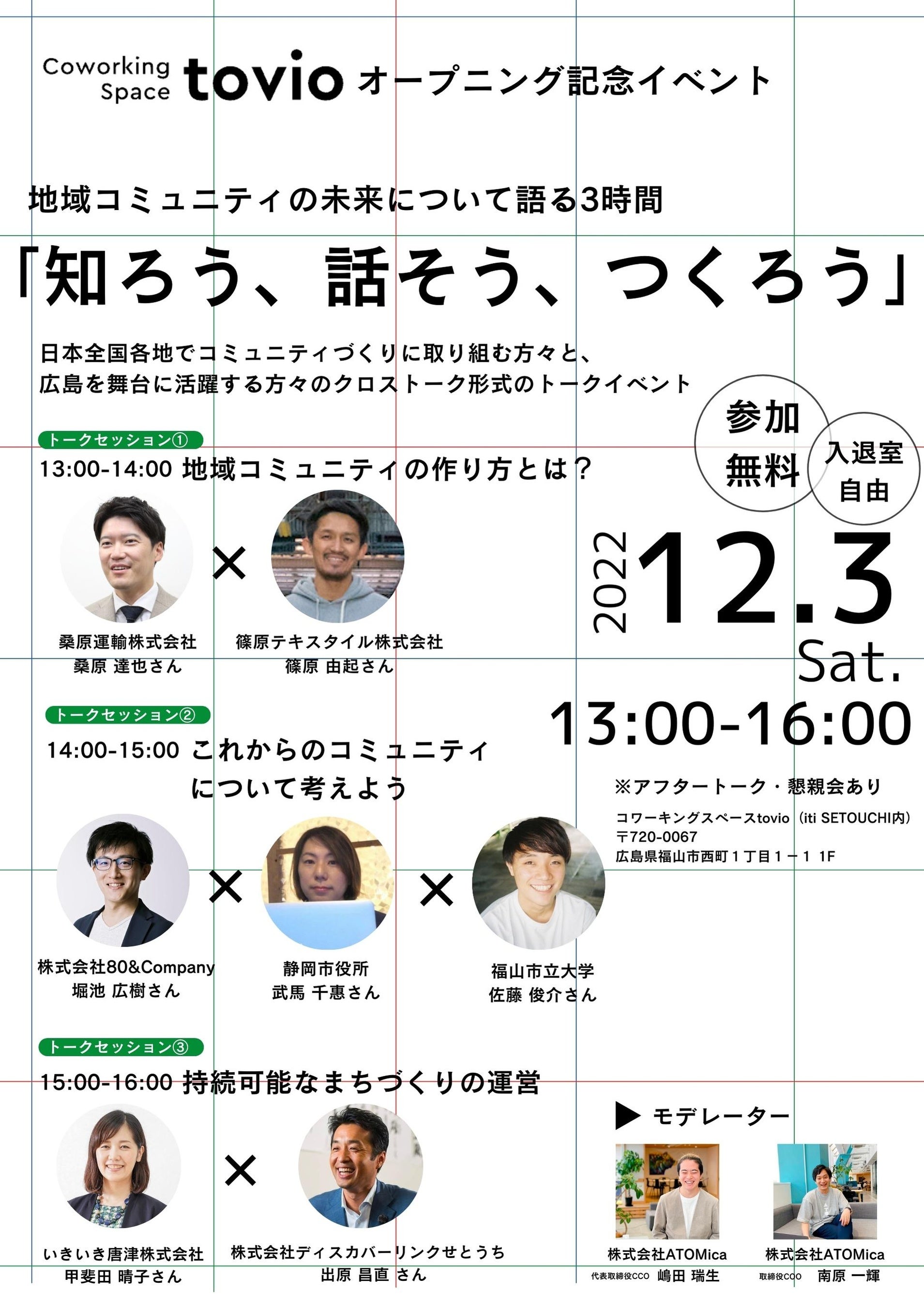 ソーシャルコワーキングスタートアップの株式会社ATOMica(アトミカ、以下「ATOMica」本社:宮崎県宮崎市、代表取締役CEO赤沼百生・CCO嶋田瑞生)は、福山電業株式会社(本社:広島県福山市昭和町、代表取締役社長:島田宗輔)と事業連携したコワーキングスペース「tovio」(以下tovio)を2022年11月30日、iti SETOUCHI内にオープンします。