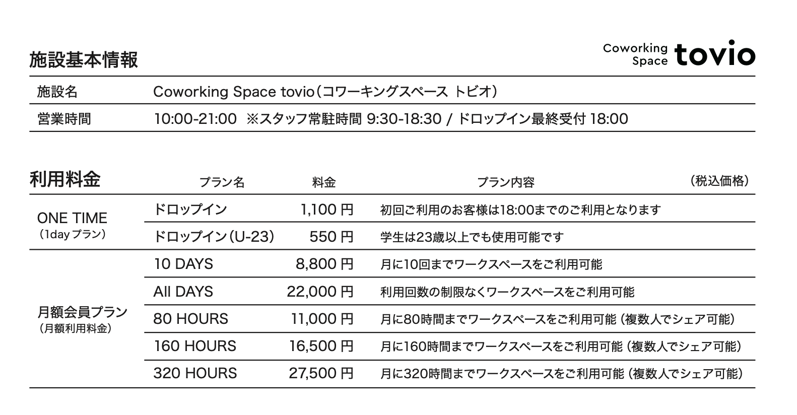tovioを体験いただくオープニングプログラムとして、11月 30 日(水)から12 月 4 日(日)の 5 日間をコワーキング利用料金無料の開放日として設け、tovio の空間と機能を体験いただきます。スタッフによる館内ツアーも実施いたします。