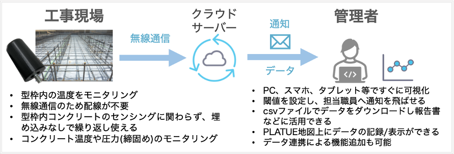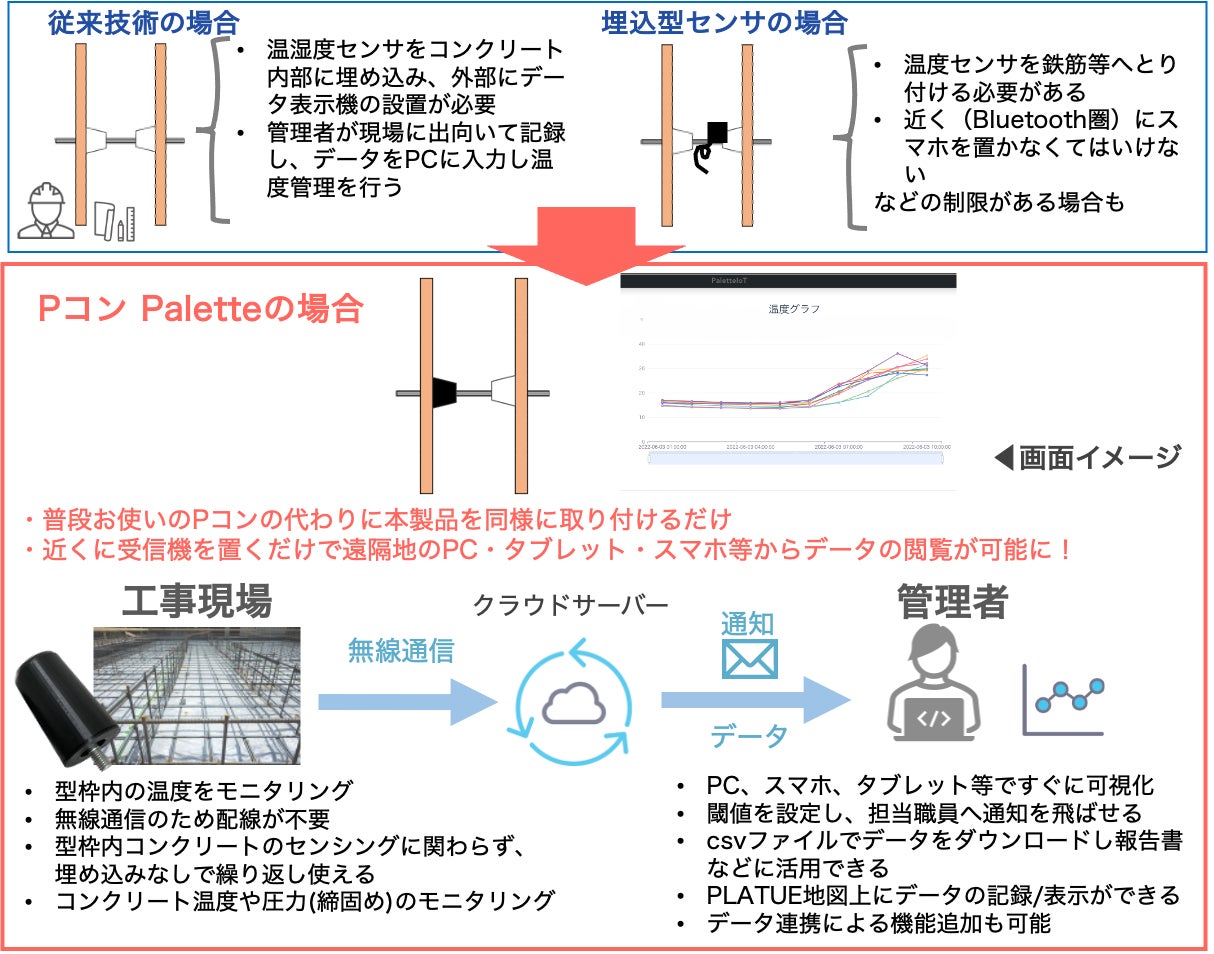 PコンPaletteは、コンクリート型枠内に埋め込むことで、コンクリート内部の温度や圧力を無線通信で計測できるシステムです。型枠除去時に取り外せるため、残置物ゼロで計測可能です。