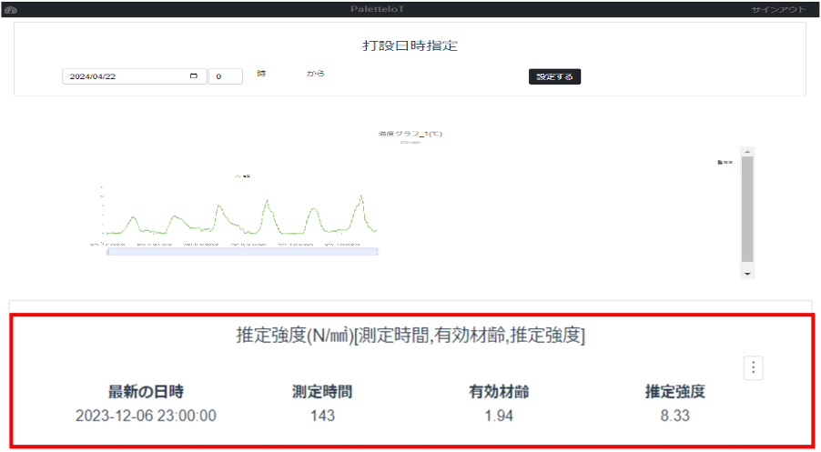 打設日時を指定することで、測定時間、有効材齢、推定強度を自動的に表示し、コンクリート強度管理の効率化を図ります。