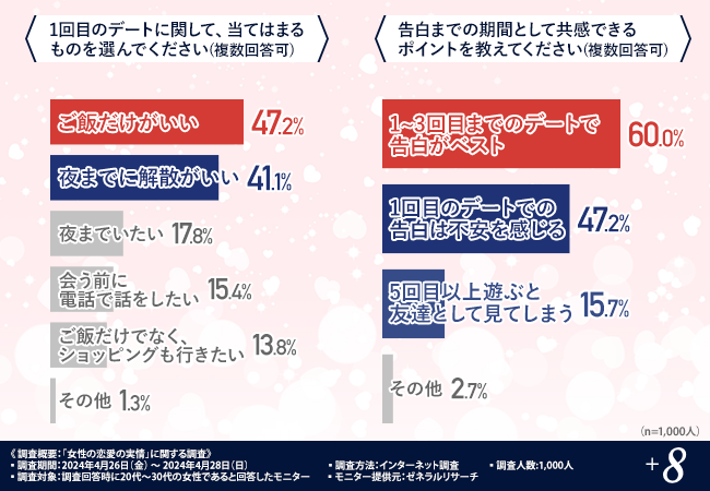 初めてのデートはご飯だけ、夜までに解散を好む女性が多く、3回目までのデートでの告白がベストタイミングだと思う方が6割以上いるようです。
