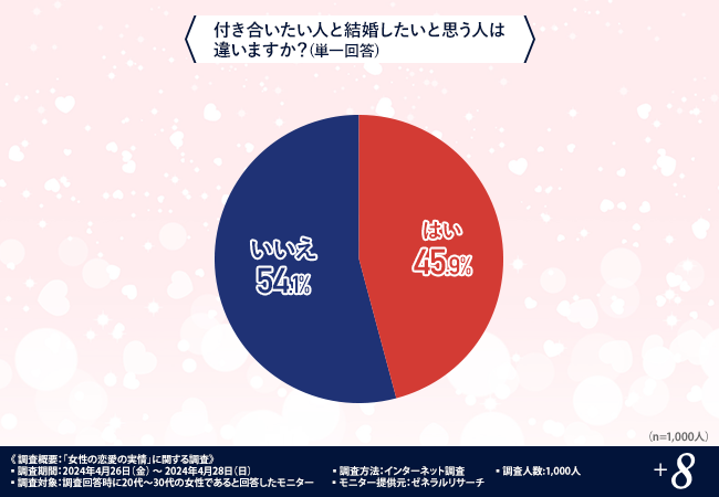 最後に、「付き合いたい人と結婚したいと思う人は違いますか?(単一回答)」と質問したところ、『はい(45.9%)』『いいえ(54.1%)』という回答結果になりました。