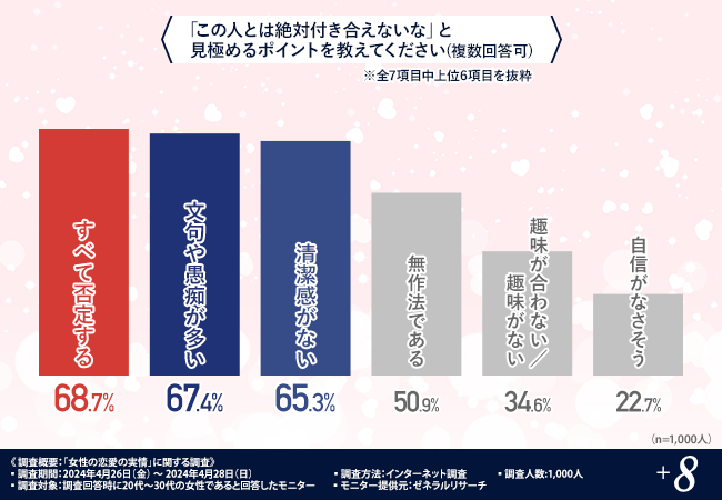 「“この人とは絶対付き合えないな”と見極めるポイントを教えてください(複数回答可)」と質問したところ、『すべて否定する(68.7%)』と回答した方が最も多く、次いで『文句や愚痴が多い(67.4%)』『清潔感がない(65.3%)』と続きました。