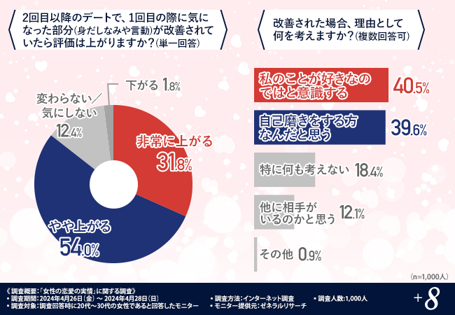 1回目のデートで気になっていた部分が改善されていたら、相手の評価は上がると回答した方が非常に多いですが、改善された理由は何だと思うのでしょうか。