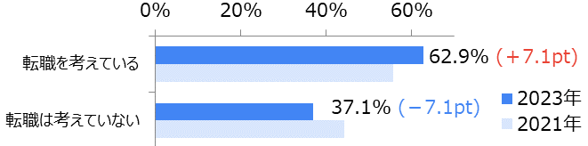 転職を考えている外国人社員は2021年から7.1pt増え、62.9%となりました。Q8で転職経験者の割合が増えていることがわかりましたが、現在転職を考えている外国人社員の割合も増加傾向にあるようです。
