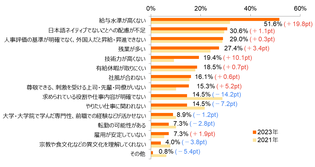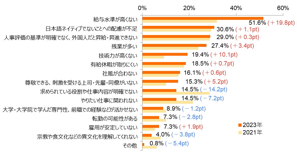 1位「給与水準が高くない」が2021年から19.8ptも増え、5割超(51.6%)となりました。国によっては、留学経験者に対して日本以上の高い水準の給与を支払うケースもあるため、そういった国や地域の出身者から見ると、日本の給与水準が思ったほど高くないという印象になったと推測されます。5位「技術力が高くない」(19.4%)も2021年から10.1pt増え、日本企業は“給与水準が高い”“技術力が高い”と思う外国人社員の割合が減っていることがわかりました。また、2位「日本語ネイティブでないことへの配慮が不足」(30.6%)、3位「人事評価の基準が明確でなく、外国人だと昇給・昇進できない」(29.0%)、4位「残業が多い」(27.4%)が約3割となり、外国人社員の活躍・定着には、日本人社員側の意識改革や人事評価制度・働き方の見直しが求められる結果となりました。