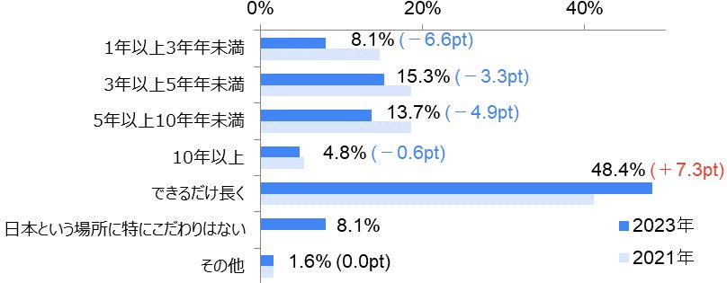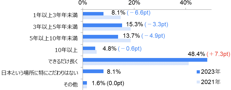「できるだけ長く」が2021年から7.3pt増え、半数近く(48.4%)となりました。明確な期間を選択する割合はどれも減少していたことから、特に期間を決めず、日本での雇用条件や状況に応じて、できるだけ長く働きたいと考えていることが推測できます。外国人社員は日本で勤務した後、勤務先企業の母国にある拠点や、帰国して日本企業の現地法人に入社するなど、日本で勤務した経験を母国で活かしたいと考える人もいるため、自分にとって最適な時期まで日本にいると考えているのかもしれません。