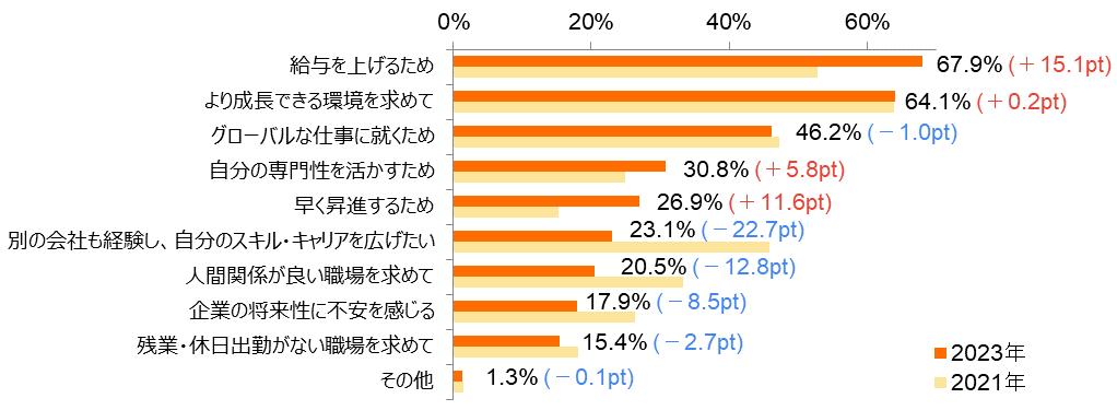 転職を考えている外国人社員に理由を聞いたところ、7割近く(67.9%)が「給与を上げるため」と回答し、2021年から15.1ptも増えたことがわかりました。また、「より成長できる環境を求めて」も6割超(64.1%)で2位となりました。優秀な外国人材が売り手市場になり、日本人だけでなく外国人も“会社を選べる”状況になってきたことがうかがえます。