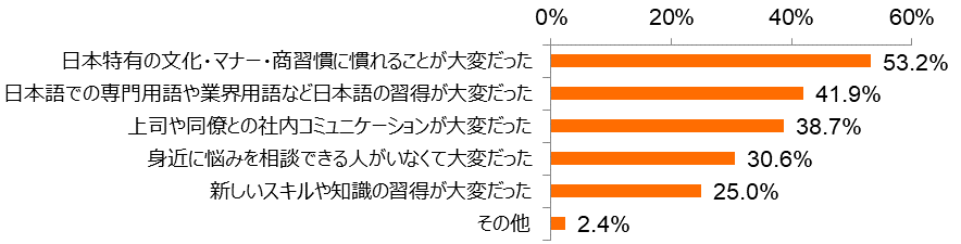 半数以上(53.2%)が「日本特有の文化・マナー・商習慣に慣れることが大変だった」と回答。次いで、「日本語での専門用語や業界用語など日本語の習得が大変だった」(41.9%)、「上司や同僚との社内コミュニケーションが大変だった」(38.7%)という結果になりました。外国人社員が自身の能力を最大限発揮して活躍できるよう、企業側はビジネスマナー研修や日本語研修を実施し、円滑なコミュニケーションを図ることが大切です。