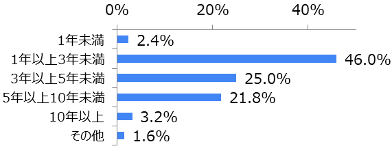 5割近く(46.0%)が 「1年以上3年未満」と最も多く、次いで、「3年以上5年未満」(25.0%)と「5年以上10年未満」(21.8%)も2割以上でした。