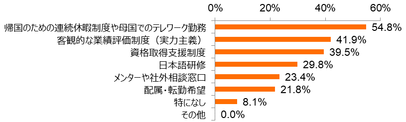半数以上(54.8%)が「帰国のための連続休暇制度や母国でのテレワーク勤務」と回答。次いで、「客観的な業績評価制度(実力主義)」(41.9%)、「資格取得支援制度」(39.5%)という結果になりました。Q4で、日本企業で働いて疑問に思うこと・改善してほしいこと(自由回答)を聞いたところ、「昇進を年功序列から実力主義にシフトしてほしい」や、「外国人に対しての評価を改善してほしい。日本人と比べて言葉の壁もあり、同じ基準で評価されるとなかなか昇給ができない」といった意見もあり、客観的な評価制度を求める外国人社員が多いことがわかりました。