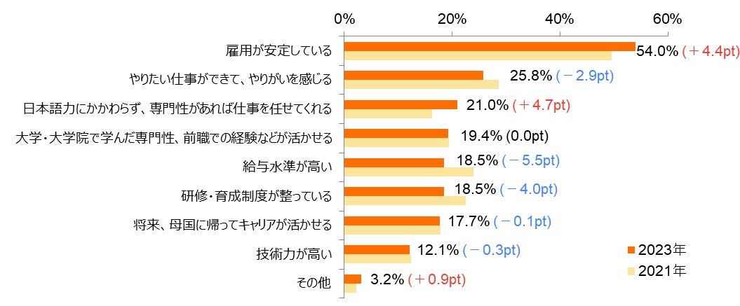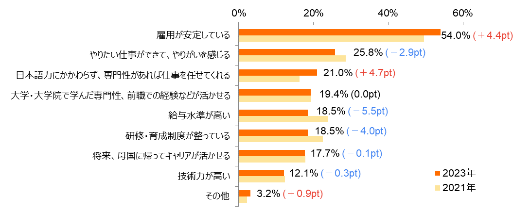 「雇用が安定している」(54.0%)が2021年から4.4pt増え、2位の「やりたい仕事ができて、やりがいを感じる」(25.8%)と倍以上の差をつけて1位になりました。世界的に先行き不透明な経済情勢が続く中、日本企業に浸透している「長期雇用」は外国人社員にとって魅力となっているようで、2021年からさらに傾向が強まっていることがわかりました。