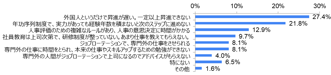 転職を考えている外国人社員の3割近く(27.4%)が「外国人というだけで昇進が遅い。一定以上昇進できない」と感じていることがわかりました。「年功序列制度で、実力があっても経験年数を積まないと次のステップに進めない」も2割以上(21.8%)となりました。