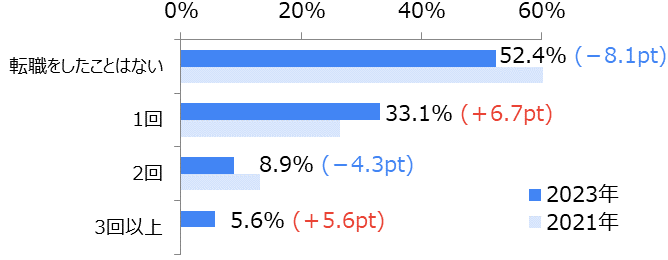 一方、転職をしたことがある外国人社員は5割近く(1回33.1%+2回8.9%+3回5.6%=47.6%)まで増え、転職経験者と未経験者の割合の差が縮まりました。