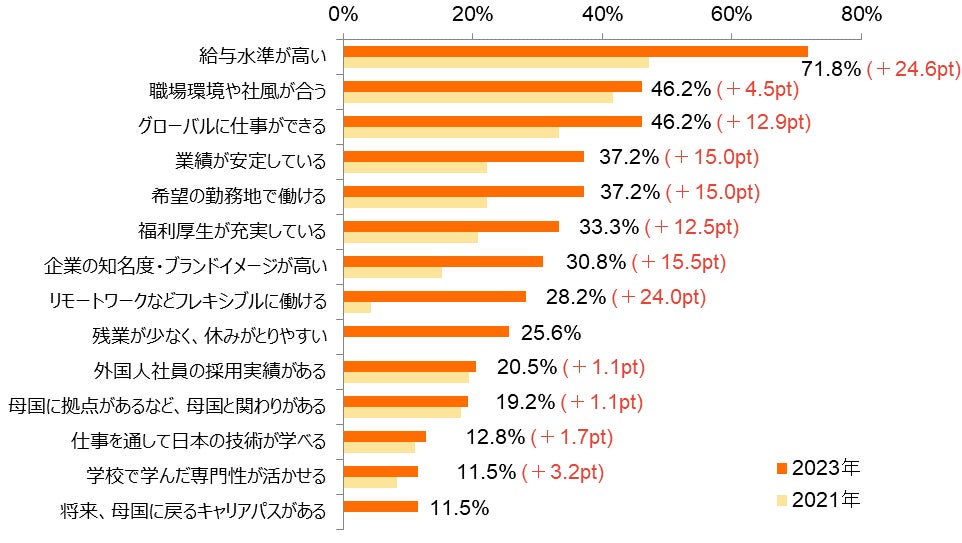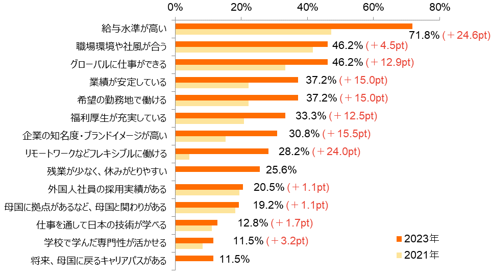転職を考えている外国人社員に転職の企業選びで重視する点を聞いたところ、7割以上(71.8%)が「給与水準が高い」と回答しました。2021年から24.6ptも大幅に増え、傾向が強まっています。また、「職場環境や社風に合う」(46.2%)と「グローバルに仕事ができる」(46.2%)も5割近くが回答しました。
